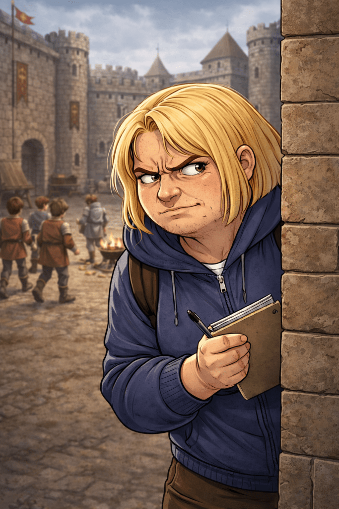 Soleias, le vaillant petit chevalier déjeunait avec quelques fidèles camarades. Ils riaient doucement, comme des écuyers profitant d’un rare instant de paix avant le retour des devoirs et des surveillants lunatiques.